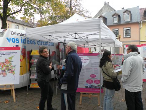 Après Neudorf, le bus de la Démocratie locale des équipes municipales a fait un arrêt ce jeudi matin, jour de marché, à la Montagne Verte, place d'Ostwald. La démarche : informer et faire participer les quelques habitants du quartier au projet du parc naturel urbain (PNU) qui concerne l'Elsau, la Montagne Verte et Koenigshoffen (télécharger le plan ici). A travers un jeu, des questionnaires et des panneaux, la chargée de mission du PNU, Alexandra Wilhelm, présentait le projet.