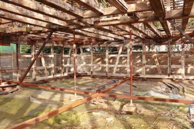 [ Plein écran ] Des équerres et traverses en métal consolident l’ossature de la maison à colombages de la rue Adler pour faciliter son déplacement. ©Juliette Vienot