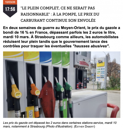 Cette augmentation du prix du baril de pétrole mondial a des répercussions jusque dans nos stations-services en France où les prix s'envolent depuis le 28 février dernier. Le gazole a même dépassé les 2 euros par endroits mardi : « Le plein complet, ce ne serait pas raisonnable » : à la pompe, le prix du carburant continue son envolée