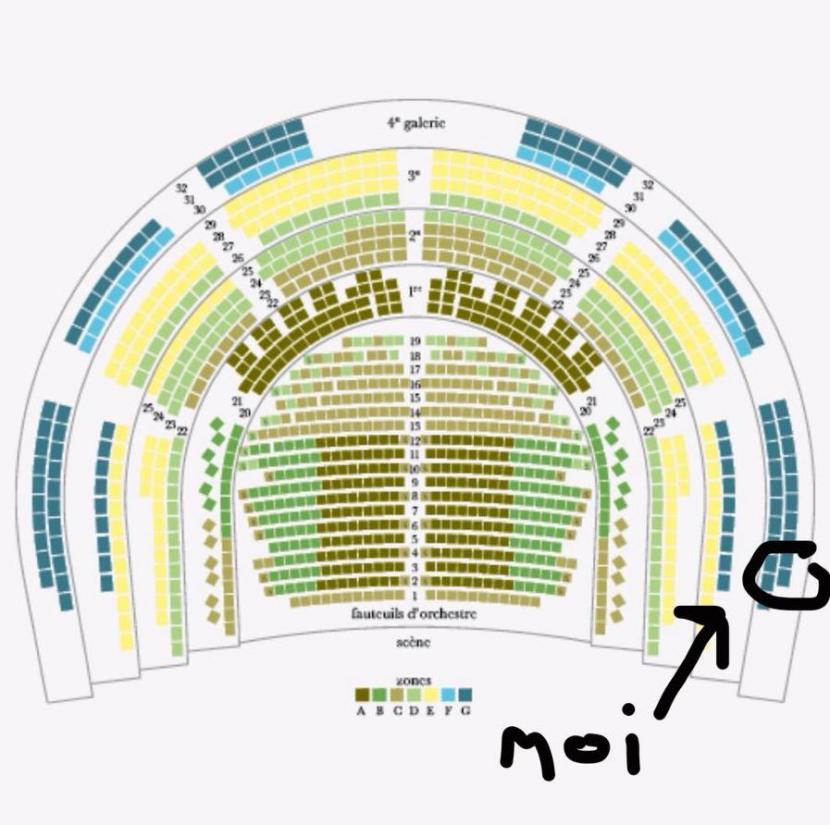 Même incliné sur les sièges devant moi, je ne vois que deux tiers de la scène, toute la partie gauche est dans mon angle mort. J’entends des bruits d'agonie, mais je ne sais pas qui est mort. Des dialogues sont prononcés, mais je ne sais pas par qui. J’ai l’impression de rater une partie de la pièce. Les dernières rangées sont les moins chères, à 7,50 € pour les moins de 28 ans et les demandeurs d’emplois. Les prix grimpent jusqu’à 103 € pour les meilleurs sièges. Toujours selon Les Forces Musicales, le prix moyen d’un billet était de 23 € pour les opéras de région en 2017. Ça va que je ne suis pas de Paris, une place pour l’Opéra Garnier ou celui de Bastille coûtait en moyenne 102 € en 2024 selon la Cour des comptes.