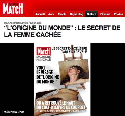 La découverte est "incroyable et miraculeuse". Paris Match dévoile en une de son numéro du 7 janvier la figure de la femme dont le sexe est représenté dans L'Origine du monde de Gustave Courbet. Le lecteur découvre pour la première fois, les deux parties d'un même tableau. "Deux ans d'enquête, d'expertises et d'analyses" d'un collectionneur d'art, ont été nécessaires pour avoir l'assurance que le second tableau est bien issu d'une unique toile découpée par le peintre lui-même. Le "bas" du tableau du Français est une petite toile de 46 centimètres par 55, exposée depuis 1995 dans les salles du musée d'Orsay. Contacté par francetvinfo, le musée parisien se refuse à commenter une œuvre "expertisée dans le privé". Selon les informations du site, les experts du musée parisien rejettent la thèse d'un seul tableau.