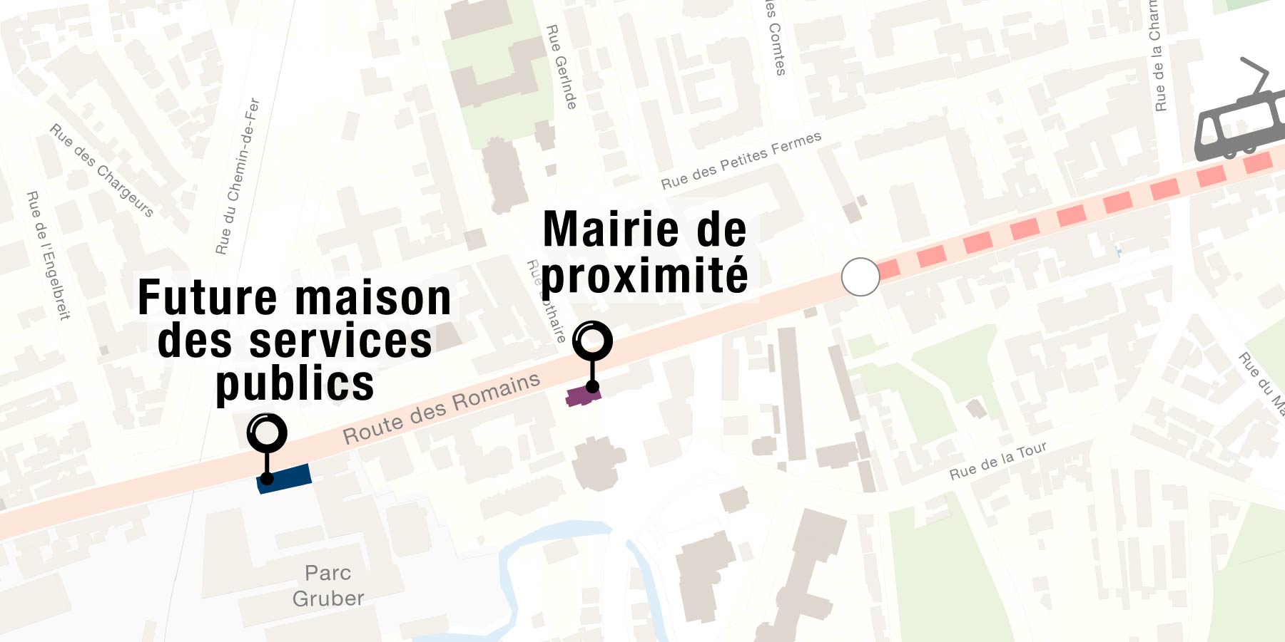Pour pallier le manque de dynamisme, la mairie de Strasbourg a la volonté de créer un centre-ville à Koenigshoffen à travers un pôle de services publics qui rassemblera la mairie de quartier, la direction de proximité, le centre médicosocial et un projet autour de la lecture. C’est l’ancien siège du RSI, acheté 900 000 euros qui accueillerait cette maison de services publics, un immeuble de 1 853 m² donnant sur la route des Romains à l’entrée du parc Gruber. La ville prévoit 2 millions de travaux de rénovation. "Il est question ici de mettre en place une dynamique en mêlant les activités économiques du parc Gruber et les services publics", dit François Desrues. "L’idée est de créer un pôle attractif avec un centre-ville", ajoute Luc Gillmann, adjoint de quartier. Pour François Desrues, les commerçants "se sont beaucoup mobilisés et ont fait leur part". Maintenant c’est aussi à la ville "d’essayer de tenir une certaine dynamique par la rénovation et l’urbanisme".
