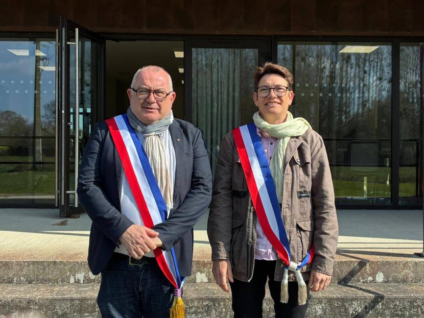 Patrick Durand, ouvrier à Laïta, devant sa mairie de Landébia (Côtes d’Armor), aux côtés de sa première adjointe Isabelle Baillet. © Document remis