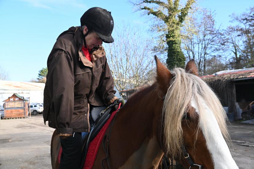 L’équitation adaptée ne se pratique jamais seule. “Ce qui compte, ce n’est pas uniquement ce qu’on fait à cheval, c’est tout ce qu’il y a autour”, insiste Jenny D’Arcy, monitrice et fondatrice de Horse’up, observant les cavaliers qui harnachent leurs montures. Dès son premier cours, Clara Bertrand a apprécié une entraide spontanée. “Les gens viennent t’aider et ça casse une barrière, ça ramène du lien social”, souligne-t-elle. Une solidarité qui se manifeste aussi bien à l’installation du matériel qu’à la montée sur le cheval, grâce au lève-cavalier. Jenny le constate aussi auprès d’autres publics, comme les femmes atteintes d’un cancer du sein qu’elle accompagne avec l’association Cocci Elles Roses : “Elles aiment le moment où elles préparent les chevaux. Elles discutent entre elles, parlent de leurs histoires.” Le centre est l’une des seules structures spécialisées en Alsace. Une rareté qui explique pourquoi les bénéficiaires du club viennent de tout le département pour s’y rendre.