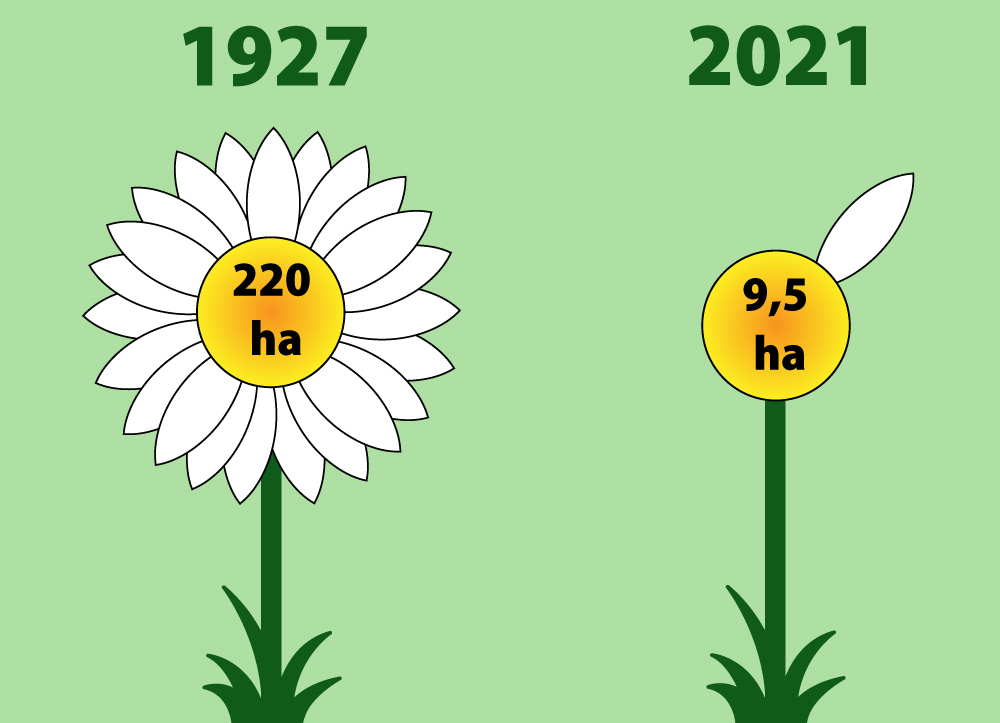 Surperficie dédiée au maraîchage et à l’horticulture de l’âge d’or à aujourd’hui, en hectares. ©Lisa Ducazaux et Louise Llavori