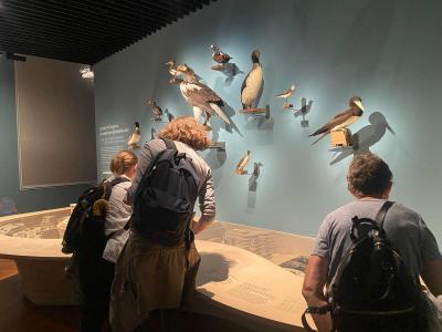 Dans la première salle, dédiée à la biodiversité, Guillaume Laugel (au centre) s’intéresse aux différentes espèces d’oiseaux. © Anouk Seveno