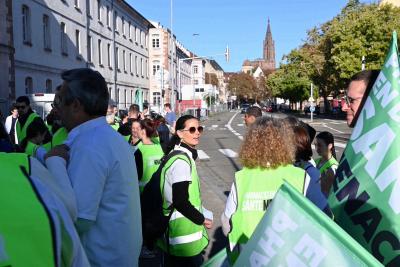 En guise d’hors d'œuvre, c’est un autre mouvement qui, dès 9 heures, tente de se faire entendre en marge de la grande coalition syndicale qui doit s’ébrouer dans l’après-midi. Gilets jaunes floqués « pharmaciens menacés, santé en danger », verbe haut mais très poli, le mouvement des pharmaciens et pharmaciennes fait du bruit devant l’entrée de la cité administrative Gaujot. « Pendant le Covid-19, on était sollicités tout le temps, et là, on nous poignarde dans le dos », s’insurge Chantal Windstein, 65 ans, de La Petite-Pierre, au nord de Saverne.
