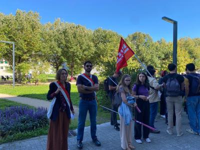 Une cinquantaine d’étudiants et étudiantes sont réunis devant la présidence de la fac pour une AG avec les différentes organisations. Dans le groupe il y a aussi des membres du personnels et deux élus de la Ville. Ils comptent d’abord se rassembler pour discuter puis partir ensemble en cortège à travers la fac avant de rejoindre la manif générale.