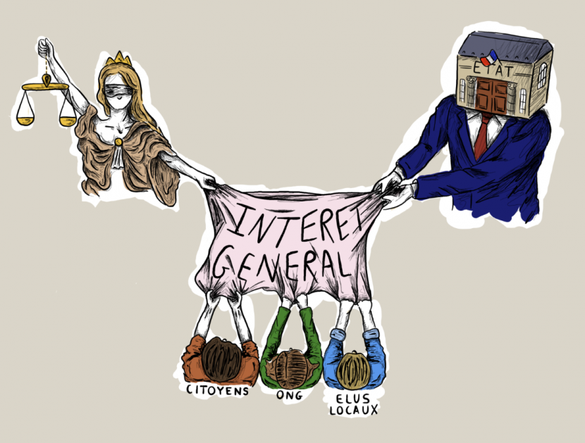 Autre dessin de presse pensé pour rendre plus visuel un article de décryptage de la notion de RIIPM. Celui-ci représente de manière figurative la bataille entre l'autorité judiciaire, l'État et les citoyens, élus locaux ou encore ONG, autour de la définition de "l'intérêt général", élément central lorsqu'il s'agit de déterminer si un projet relève effectivement d'une RIIPM ou non.
