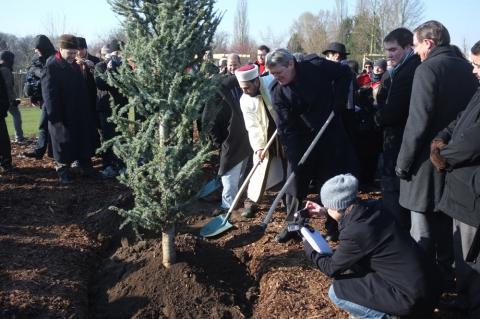 Les membres du conseil municipal et les représentants de différentes confessions, plantent un cèdre du Liban lors de l'inauguration du cimetière musulman de Strasbourg