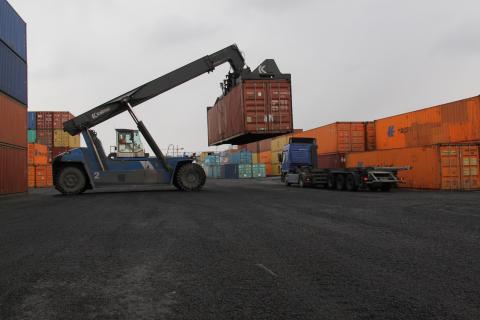 Un camion est chargé d'un conteneur. Le port compte plus de 4000 salariés.