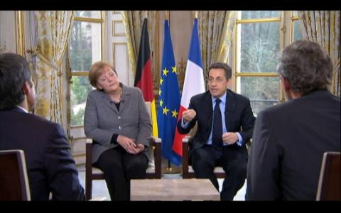 Nicolas Sarkozy et Angela Merkel lors de leur intervention commune, lundi 6 février. (Image vidéo France 2)